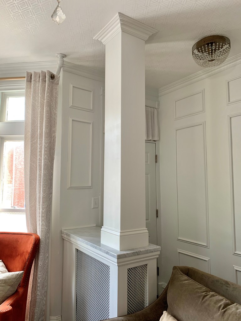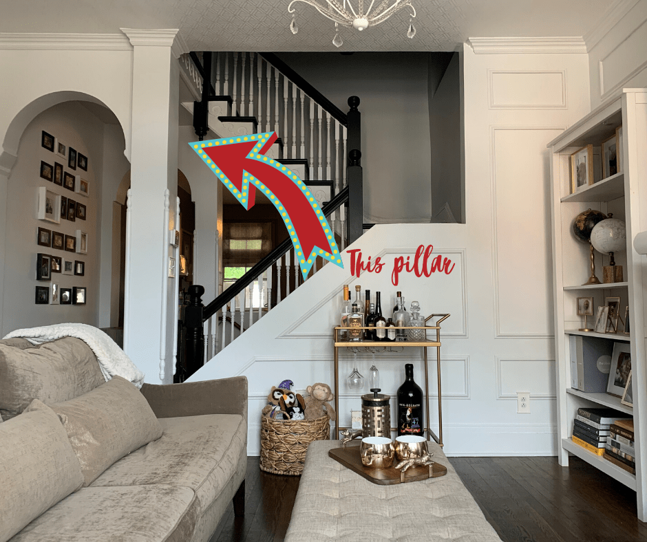 Gorgeous, but you still felt like you were walking right into the room. I didn’t want to put a wall back up because this isn’t a large room and I didn’t want it to feel even smaller. Solution – a pillar. My father created a pillar mirroring the pillar directly across the room at the base of the stairwell.